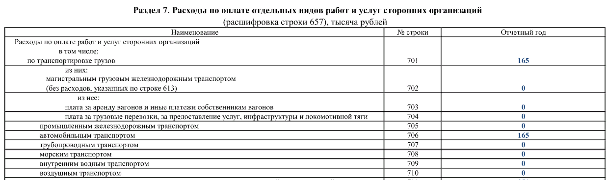 В разделе 7 даем расшифровку расходов по оплате работ и услуг, отраженных в строке 657. В строках 701–710 показываем оплату услуг по доставке грузов разными видами транспорта, за исключением расходов, указанных по строке 613.
