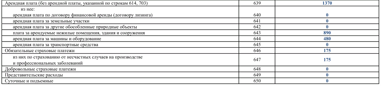 Если брали в аренду (лизинг) оборудование, транспортные средства или недвижимость, то по строкам 639–645 покажите платежи, учтенные по дебету счетов 20, 23, 25, 26, 44, 96. Платежи по обязательному и добровольному страхованию показывают по строкам 646–648.