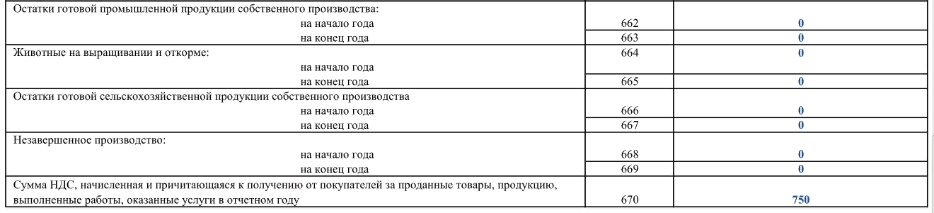 В конце раздела (строки 662–669) приводим начальные и конечные остатки по себестоимости своей промышленной и сельскохозяйственной продукции, животных на выращивании и откорме, а также незавершенного производства. Сумма НДС, причитающаяся от покупателей за проданные им товары и услуги, отражаем в строке 670 (дебет 90.3).