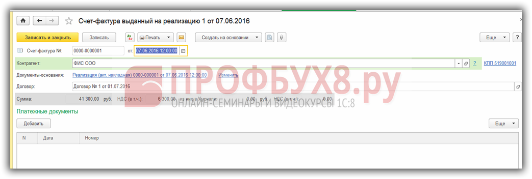 Поля документа Счет-фактура полученный будут заполнены автоматически на основании сведений из документа Поступление (акт, накладная) или Поступление НМА.