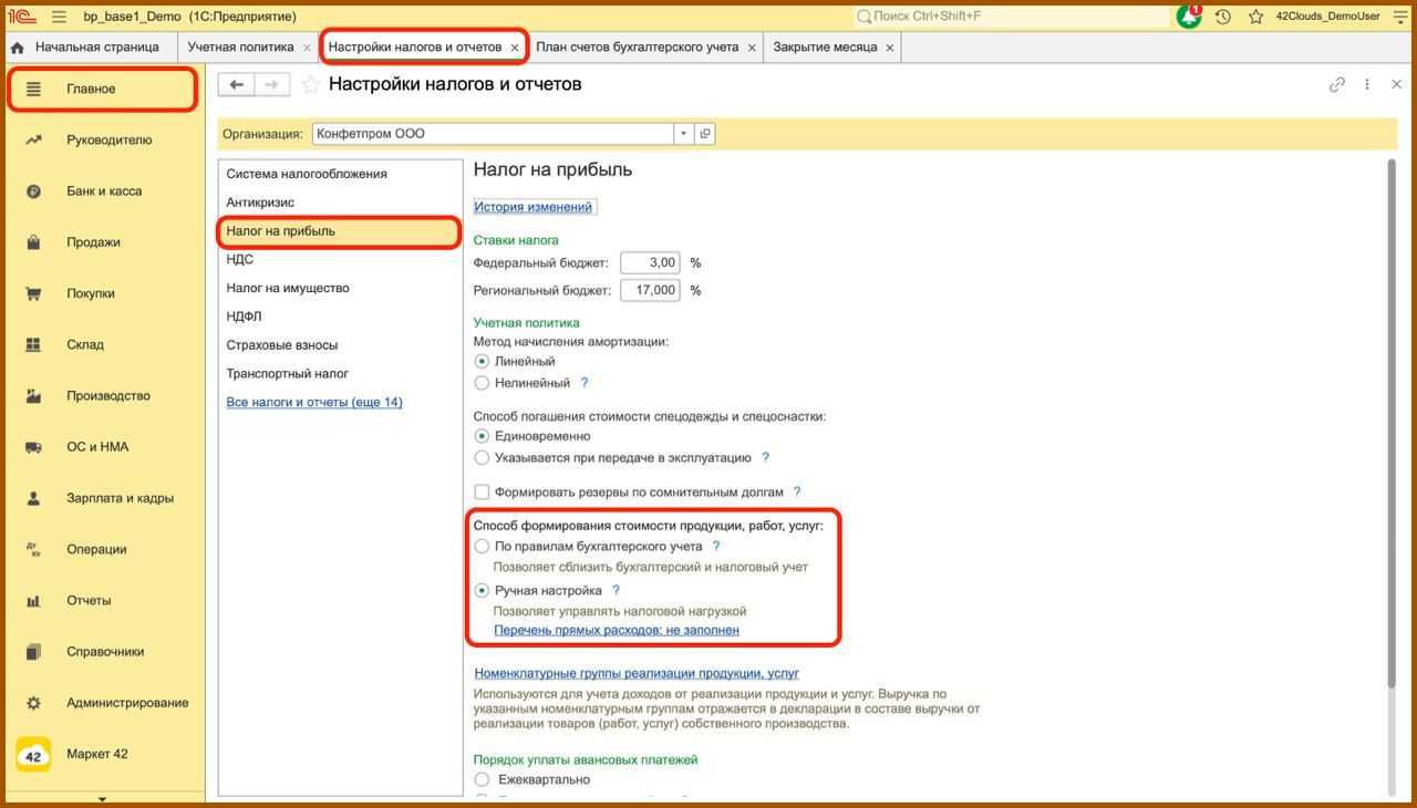 В разделе «Налог на прибыль» появился новый переключатель «Способ формирования стоимости продукции, работ, услуг». Здесь вы увидите два пункта: