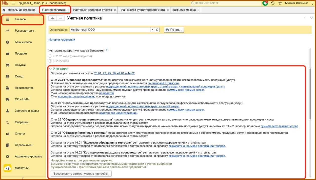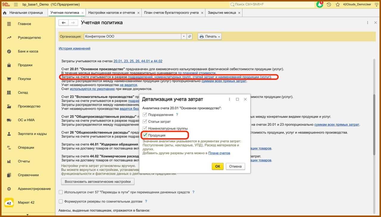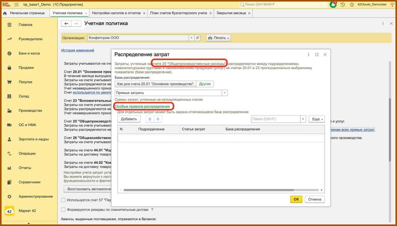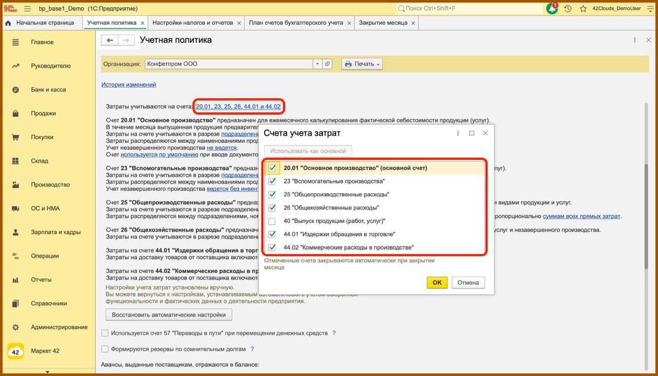 Теперь необходимо указать счета, которые используются для учета затрат, основной счет и далее по каждому счету добавить необходимые настройки. Мы с клиентами столкнулись с ошибкой, что не закрывается 20 счет, и в таких случаях всегда нужно смотреть учетную политику.