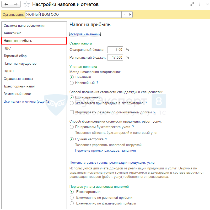 Настройки УП по налогу на прибыль задайте в разделе Главное — Настройки — Налоги и отчеты — вкладка Налог на прибыль.