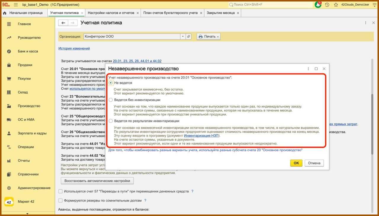 - Вариант «Не ведется». Выбираем, если нужно чтобы 20 счет каждый месяц закрывался полностью. Способ «Не ведется» рекомендуется использовать по умолчанию, он подходит для тех, кто незавершенное производство не использует.