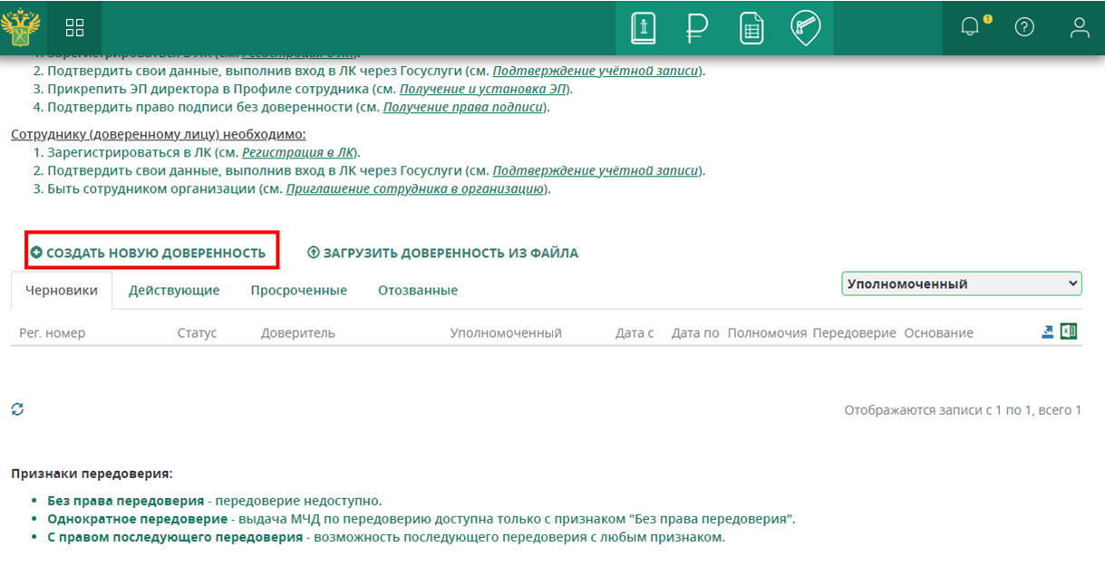 3. В списке доверенностей нажать на ссылку «Создание новой доверенности». Если данная ссылка у вас не отображается, то необходимо проверить в профиле пользователя ЛК свои полномочия. Скорее всего, ваш авторизованный пользователь не определен как руководитель организации.