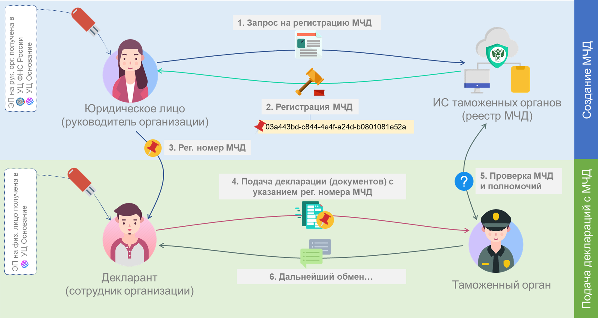 Информационный обмен можно разделить на два этапа: создание МЧД и подача таможенных документов с использованием МЧД.