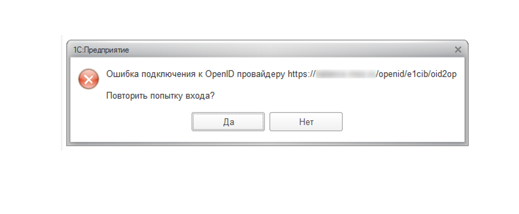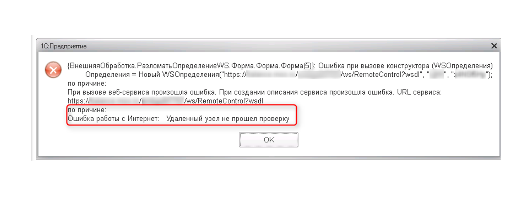 Рис.21 Окно с ошибкой про удаленный узел, который не прошел проверку в 1С:Предприятии