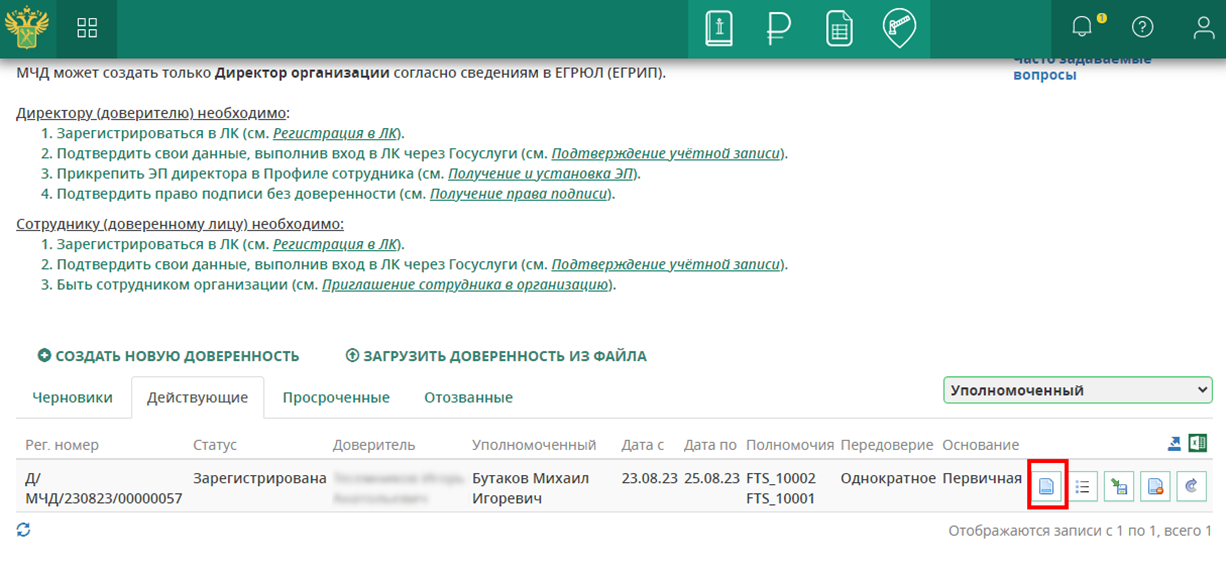 На первом этапе руководитель организации (в отдельных случаях это может быть доверенное лицо) создает машиночитаемую доверенность на сотрудника.