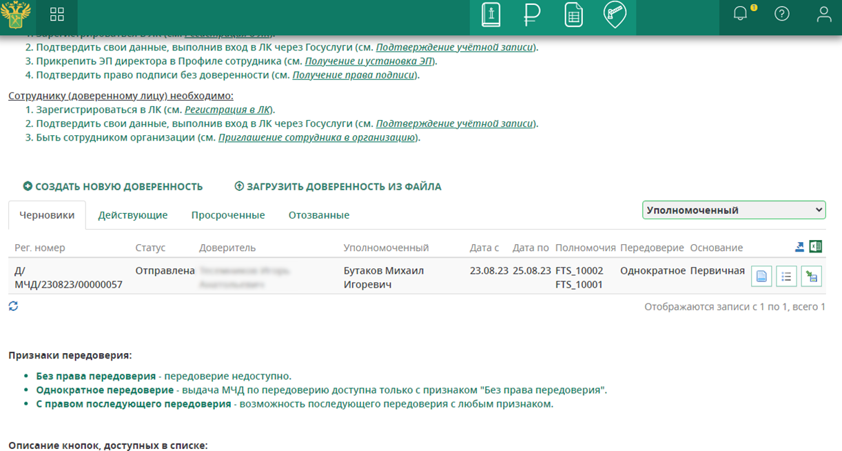 5. После этого созданная доверенность появится на вкладке «Черновики» и будет находится в статусе «Отправлена».