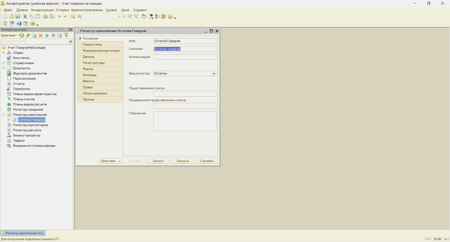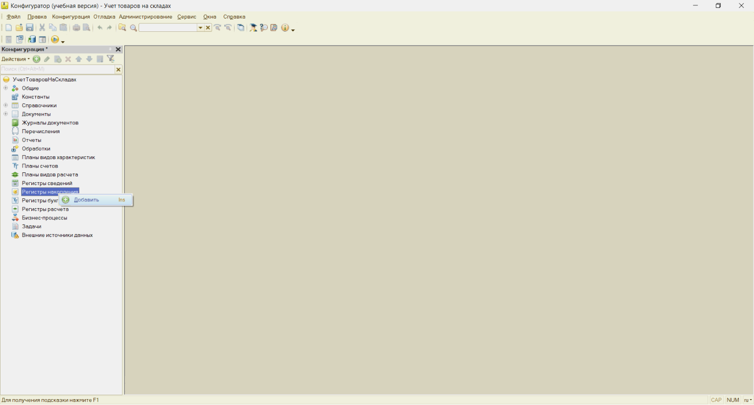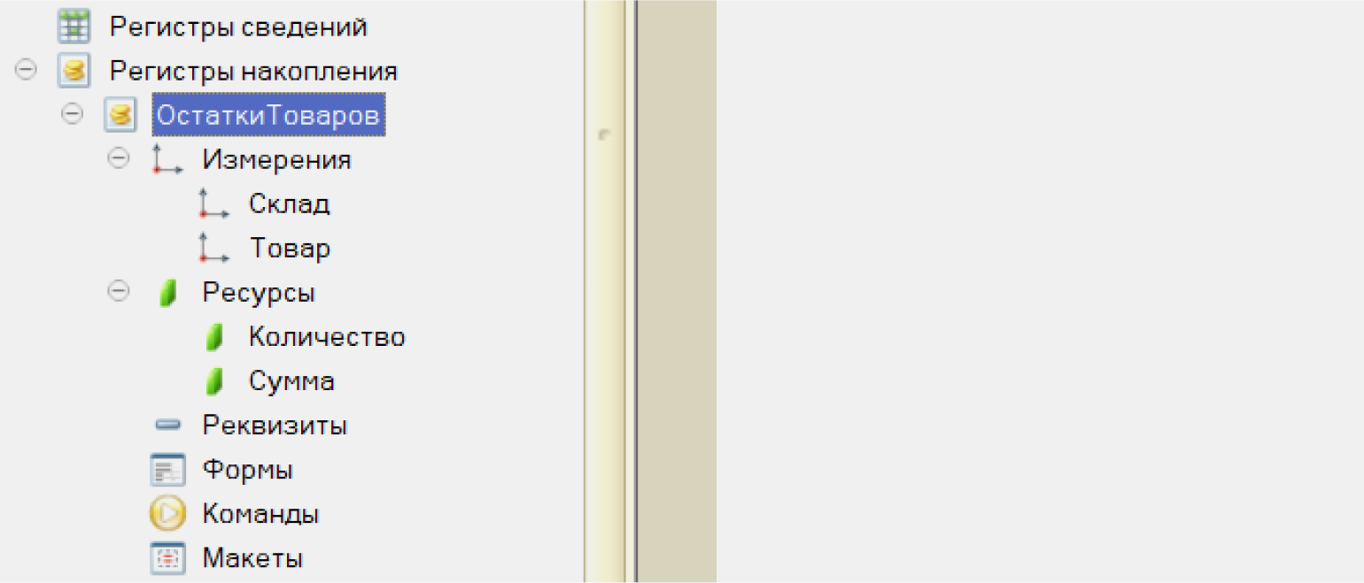 В регистрах накопления можно «накапливать» данные в разрезе нескольких измерений. Рассмотрим это на примере. Создадим регистр накопления.