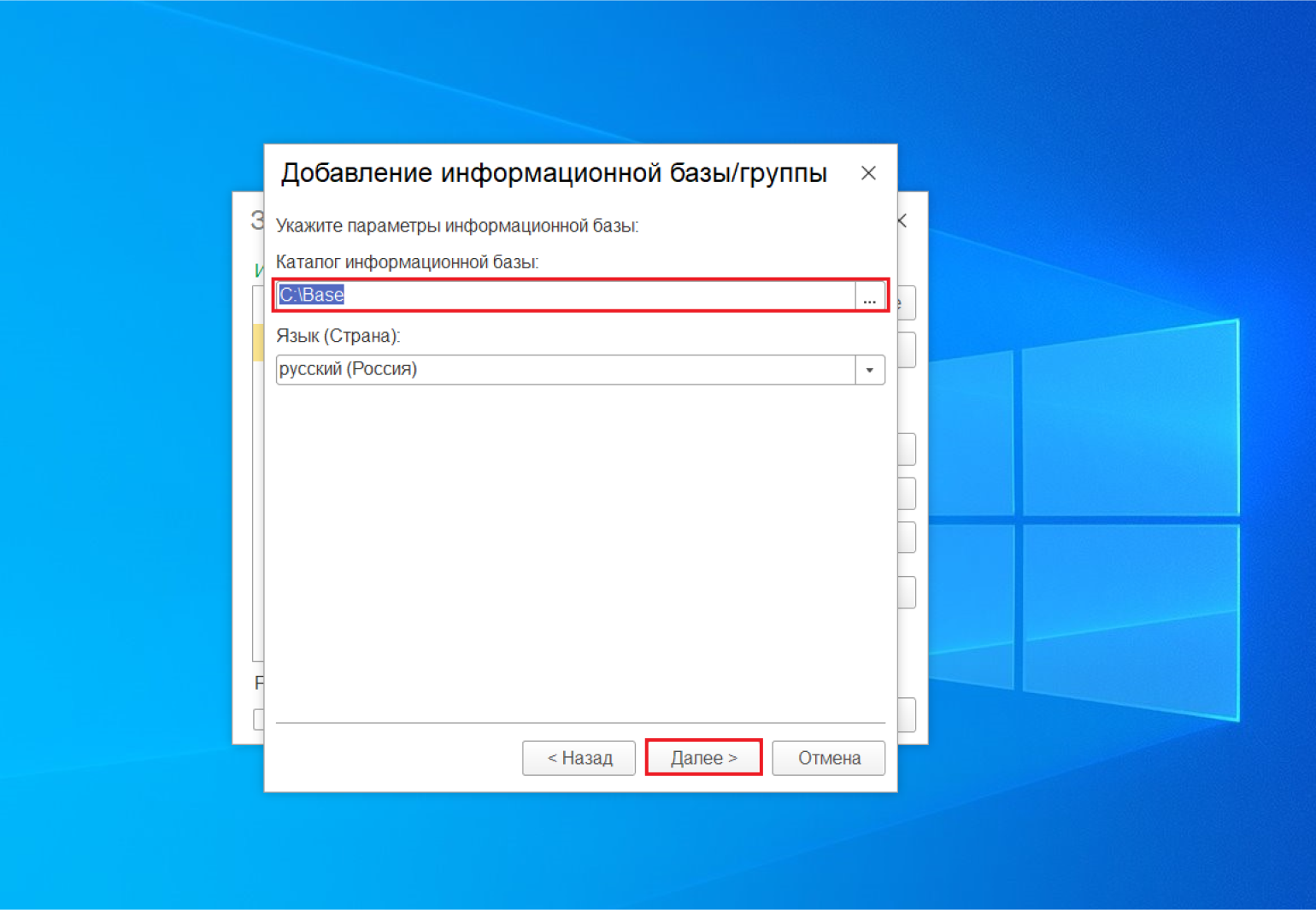 Выбираем каталог, в котором будет находиться наша информационная база, и нажимаем Далее.