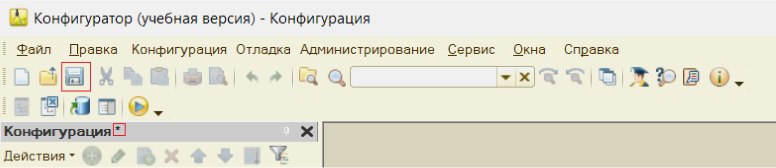 Видим, что в заголовке дерева конфигурации появился знак различия конфигураций — <!>. Это означает, что конфигурация базы данных отличается от основной. Чтобы внести в неё изменения, нужно нажать на иконку с бочонком, который отмечен на скриншоте.