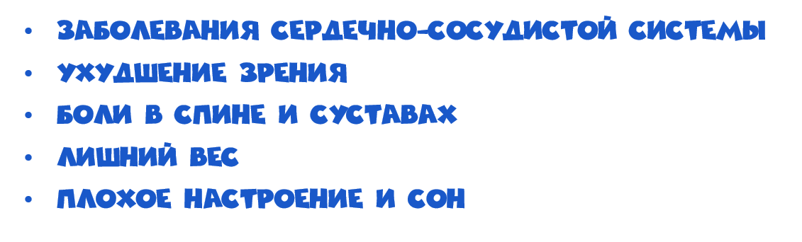 Это и проблемы с сердечно-сосудистой системой, со зрением, боли в спине и суставах (те же колени), лишний вес. Там же плохое подавленное настроение и проблемы со сном. Да вы и так все это знаете.