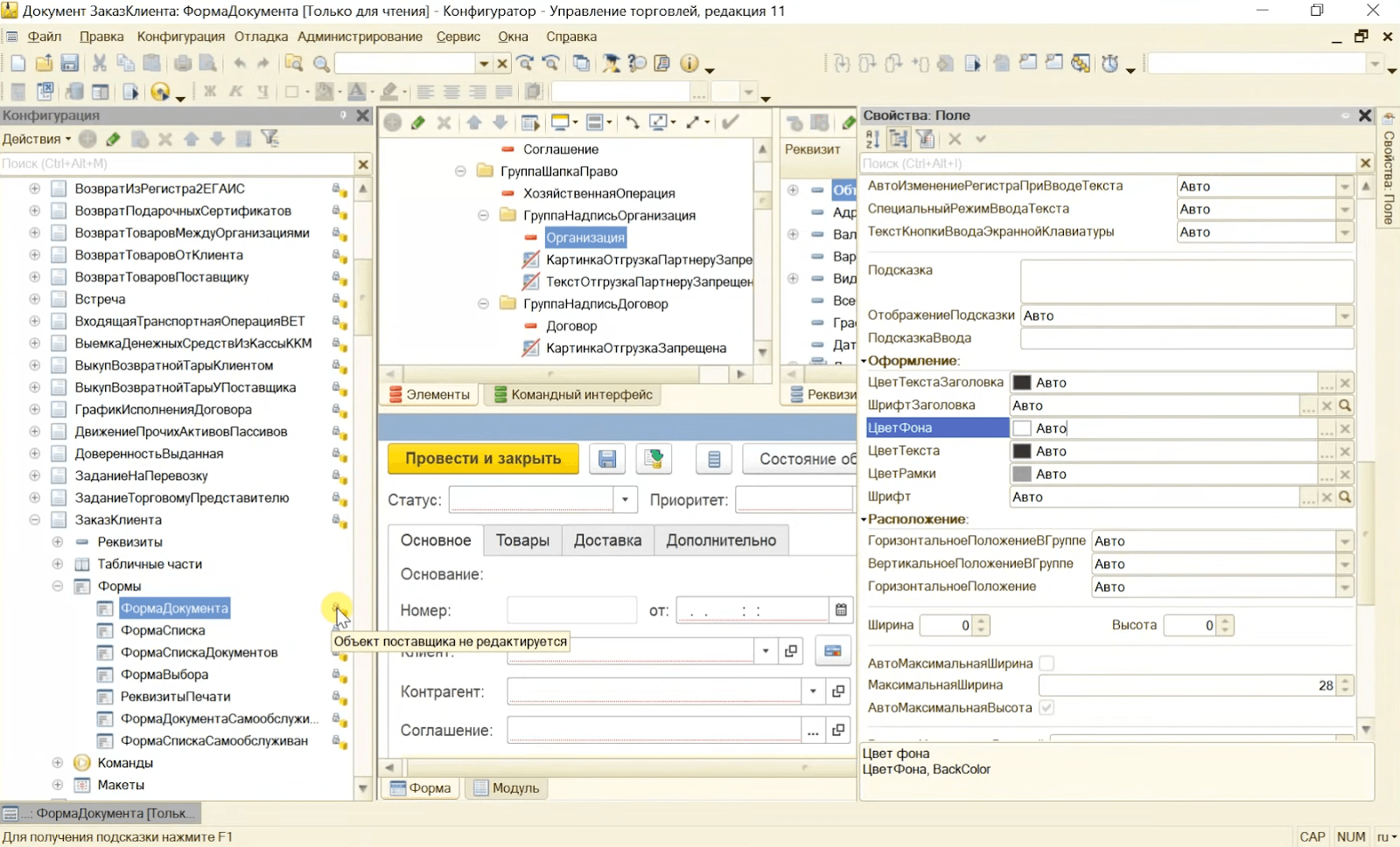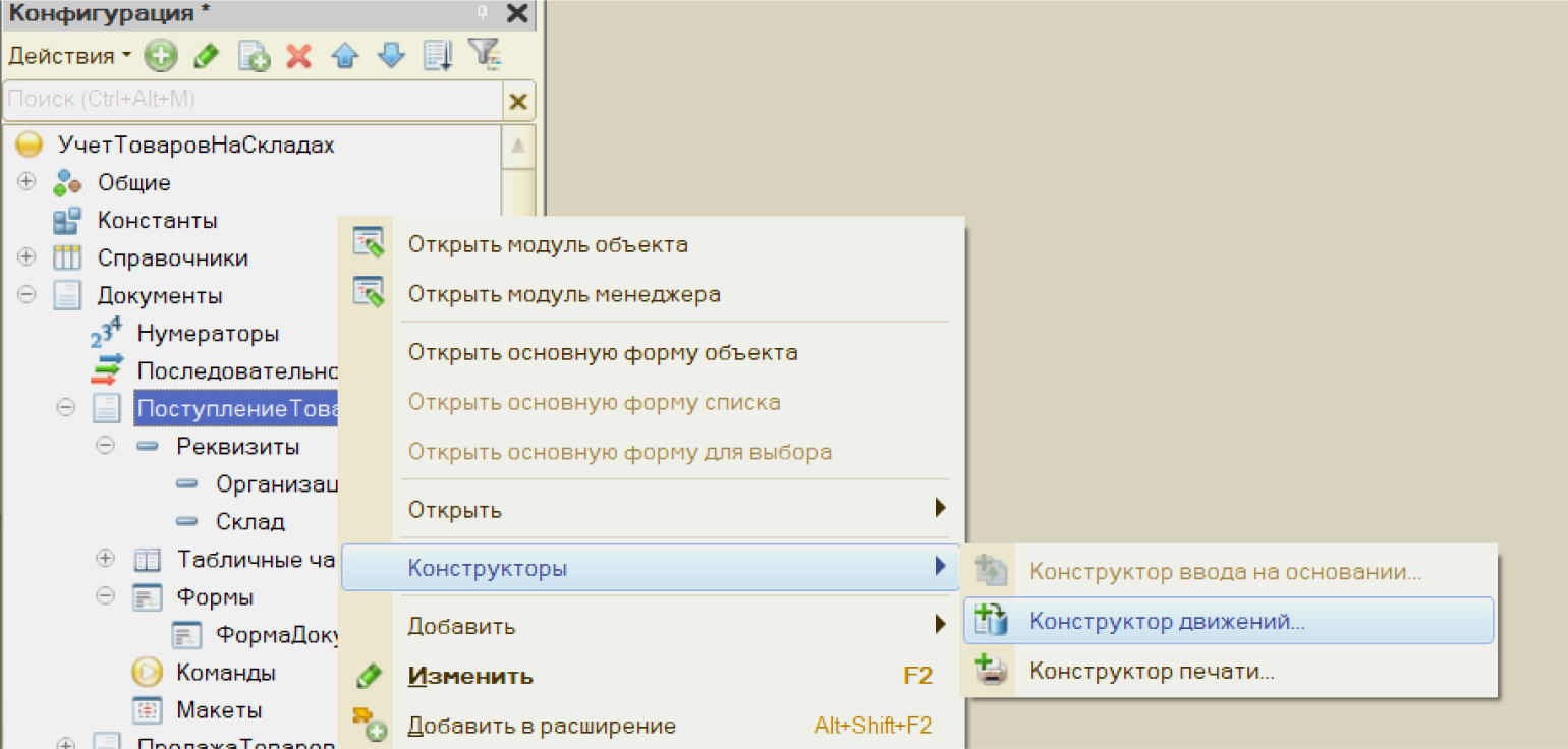 Чтобы сформировать движения регистра, перейдём в документ ПоступлениеТоваров. Кликнем правой кнопкой мыши по наименованию и выберем конструктор движений.