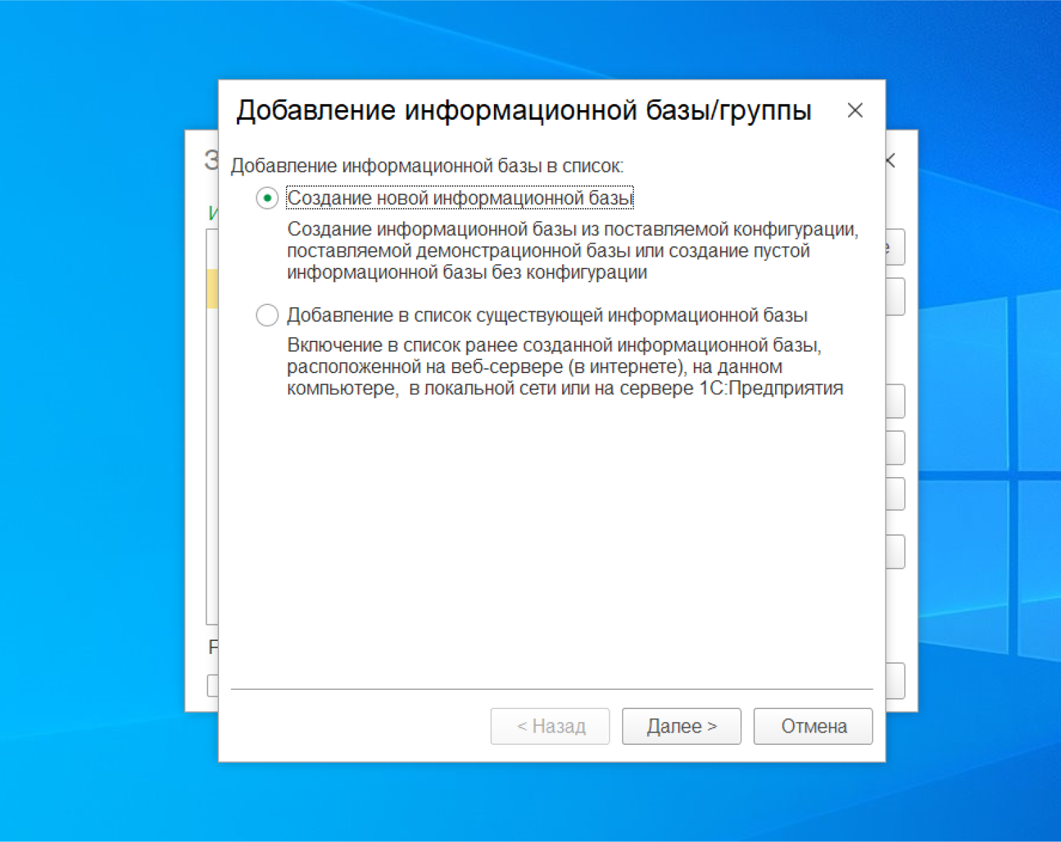 В открывшемся окне выбираем Создание новой информационной базы и нажимаем кнопку Далее.