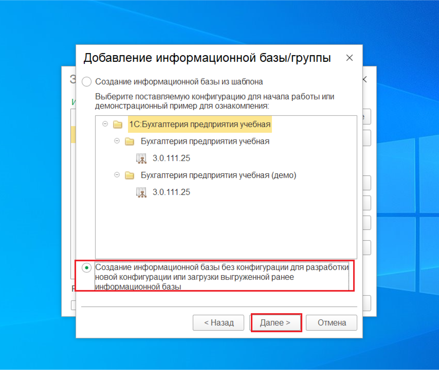 Программа предложит создать базу по шаблону «Бухгалтерия предприятия», но мы выбираем Создание информационной базы без конфигурации и нажимаем кнопку Далее.
