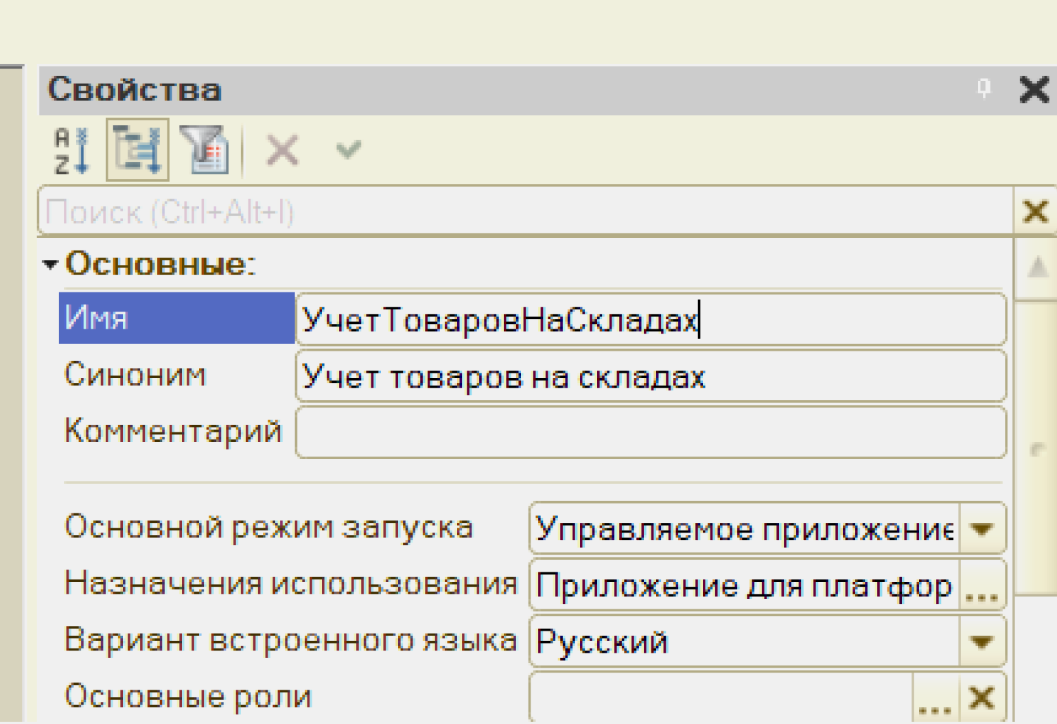 Теперь давайте дадим имя нашей конфигурации. Для этого дважды кликаем по корневому элементу с надписью Конфигурация. После этого откроется палитра свойств, где можно добавить новое имя и его синоним.