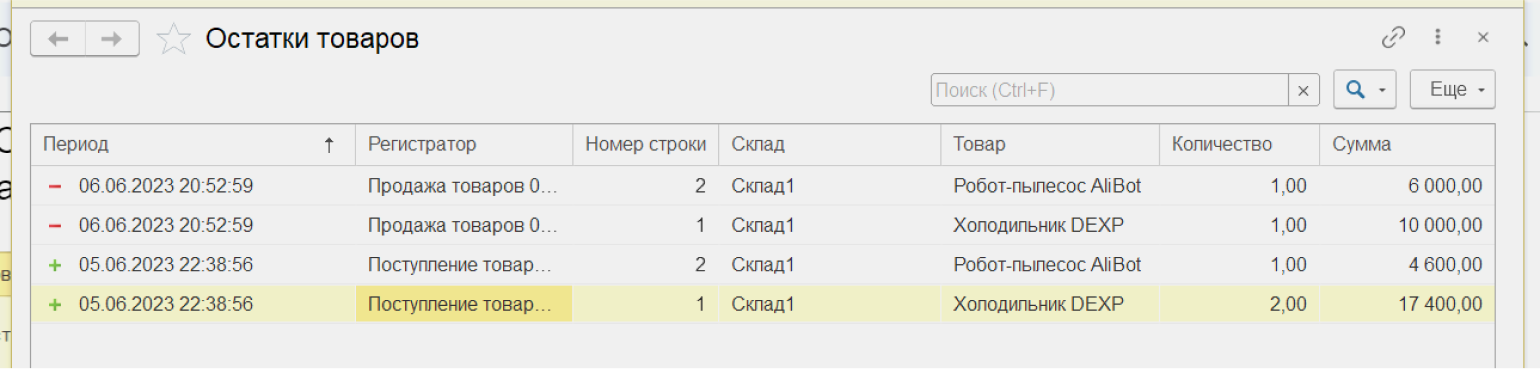 Запустим «1С:Предприятие» и проведём созданные ранее документы. Теперь в регистре Остатки товаров мы видим их движения — то есть все изменения, которые происходят с элементами документа.