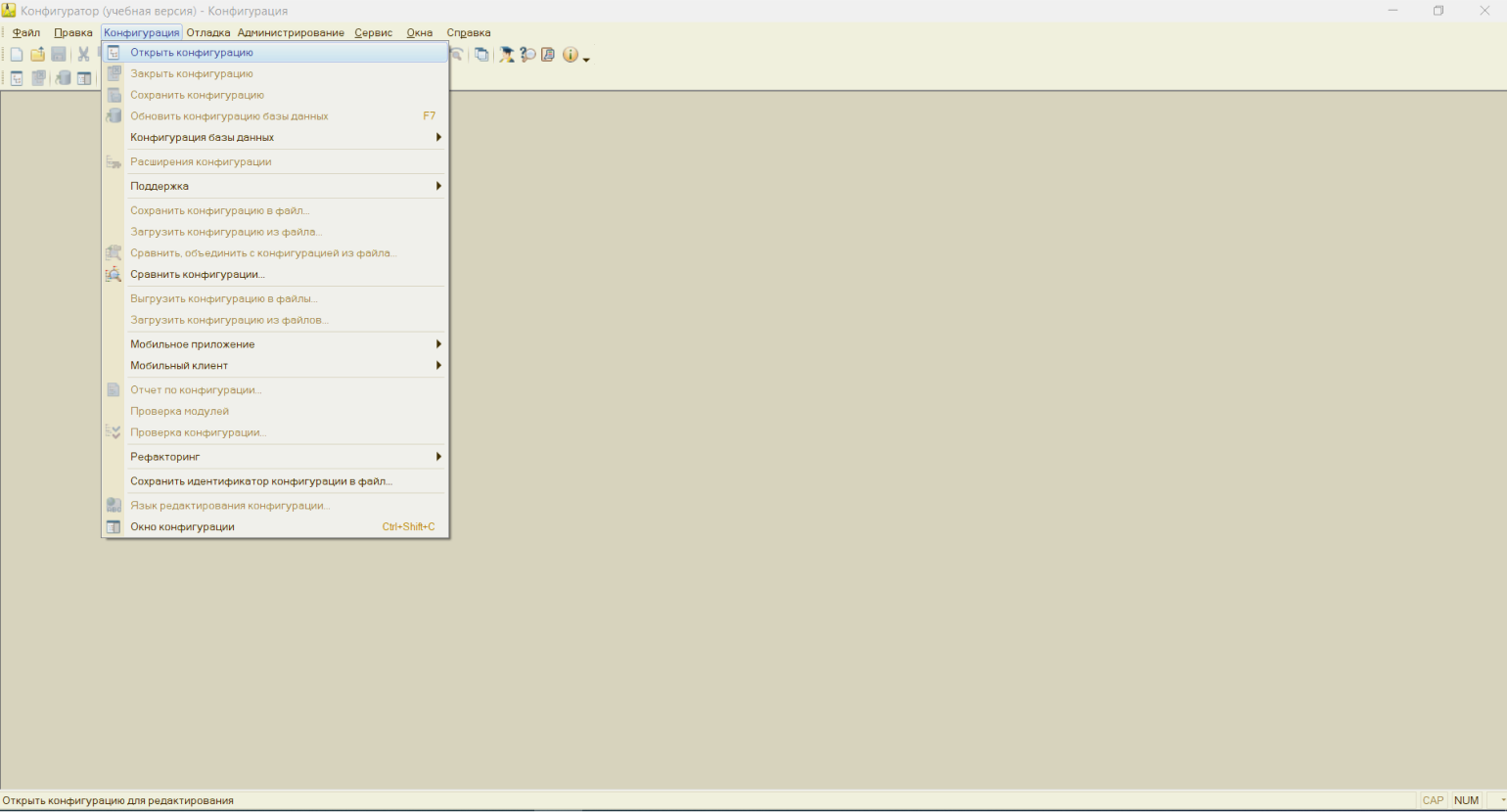 Так как наша задача — попробовать свои силы в разработке конфигураций, запускаем базу в режиме Конфигуратор. Когда программа запустится, в главном меню выбираем Конфигурация > Открыть конфигурацию.