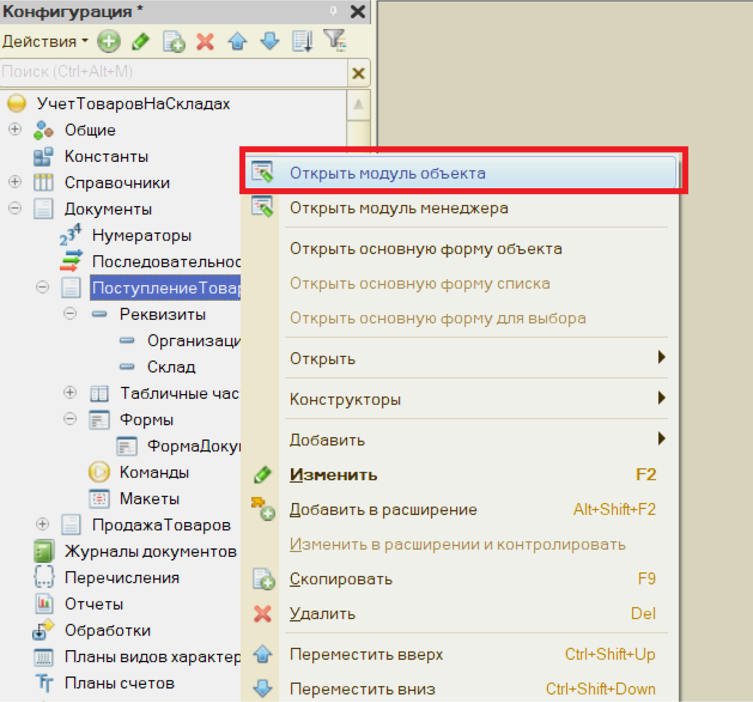 Теперь откроем модуль документа ПоступлениеТоваров»: