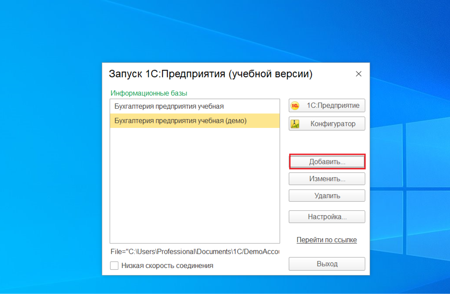 А теперь запустим программу. Сразу видим, что программа установки создала две учебные базы. Но так как мы хотим создать конфигурацию с нуля, нажимаем на кнопку Добавить.