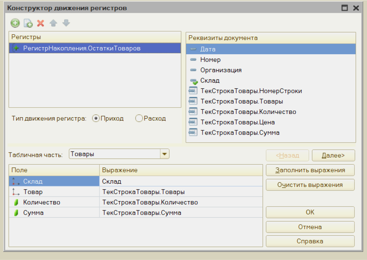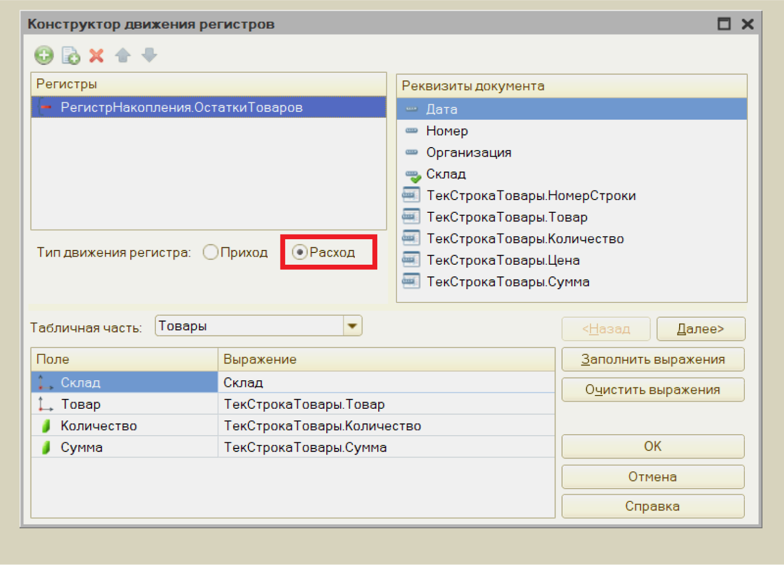 Похожим образом настроим документ ПродажаТоваров, только поставим в конструкторе тип движения Расход.