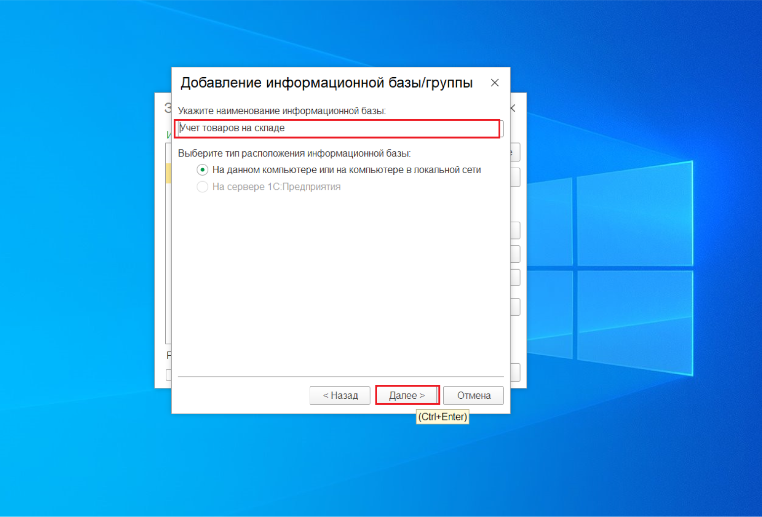 Вводим название информационной базы: Учёт товаров на складе. Нажимаем Далее.