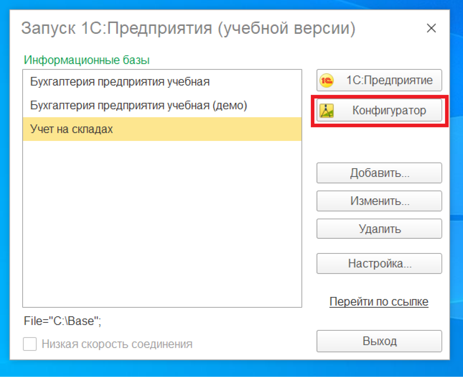 - Конфигуратор — режим для разработчика. В нём создаются прикладные решения на встроенном языке и выполняется администрирование информационной базы.