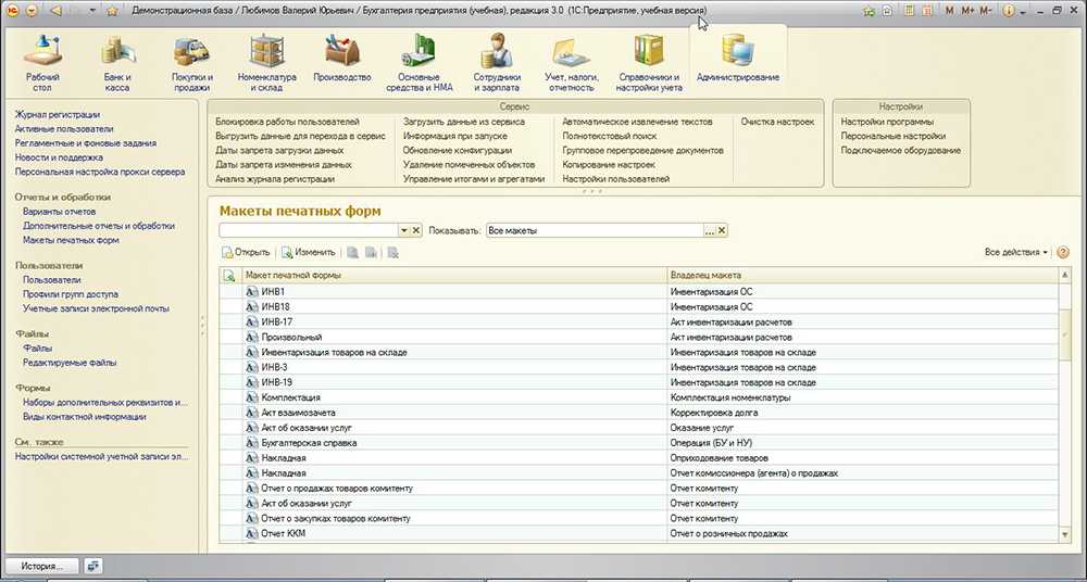 Во втором случае нужно перейти в раздел меню «Администрирование» — «Печатные формы, отчёты и обработки» — «Макеты печатных форм». В нём будут отображаться все макеты документов. Примечательно, что в этом же меню их можно и отредактировать.