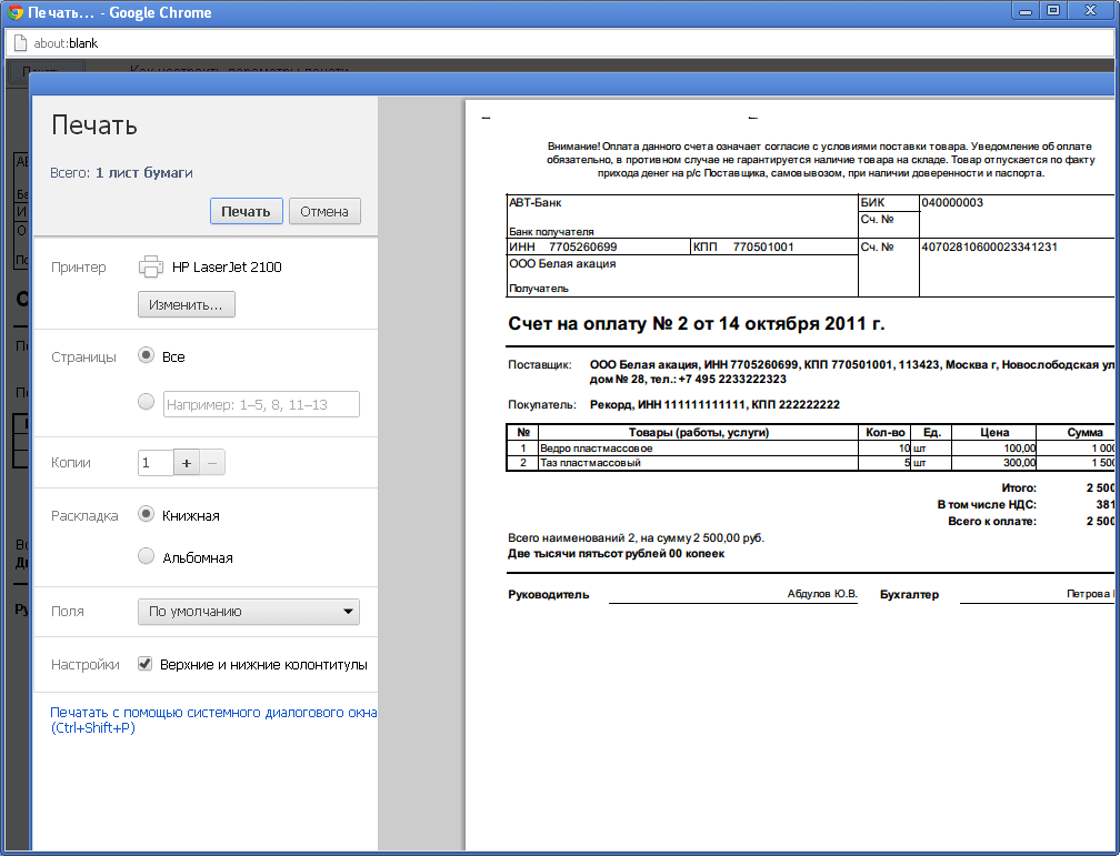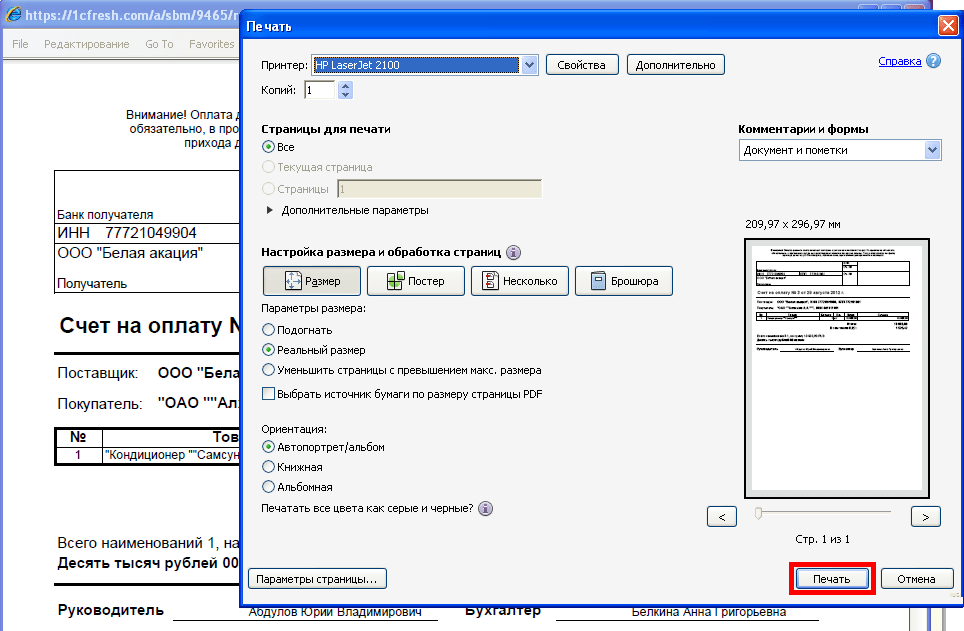 - Подтверждение печати обычно надо осуществлять два раза: сначала в форме печати 1С:Предприятия, а затем — в соответствующей форме браузера (рис. 3).
