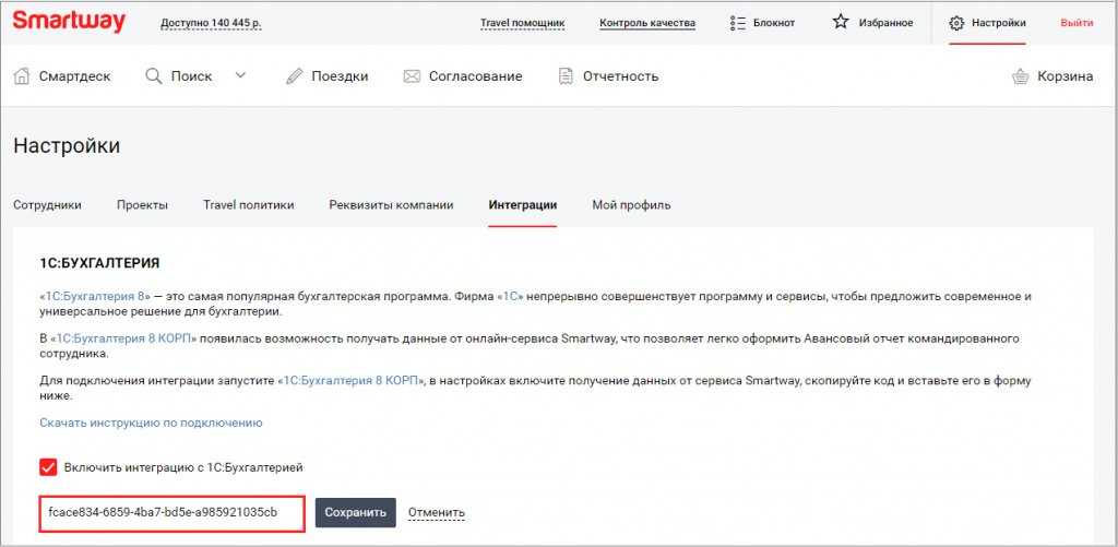 В разделе Настройки сервиса Smartway потребуется установить флаг Включить интеграцию с 1С:Бухгалтерией, указать скопированный код и сохранить выполненные настройки (рис. 2).