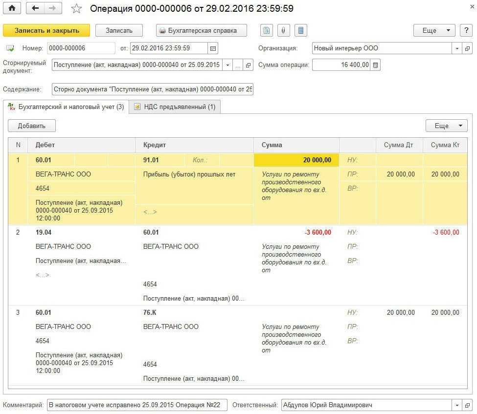 - запись СТОРНО Дебет 25 Кредит 60.01 заменить на запись Дебет 60.01 Кредит 91.01 и отразить сумму дохода прошлого периода (20000 руб.). В специальном ресурсе для целей налогового учета необходимо отразить постоянную разницу: Сумма ПР Дт 60.01 Сумма ПР Кт 91.01;