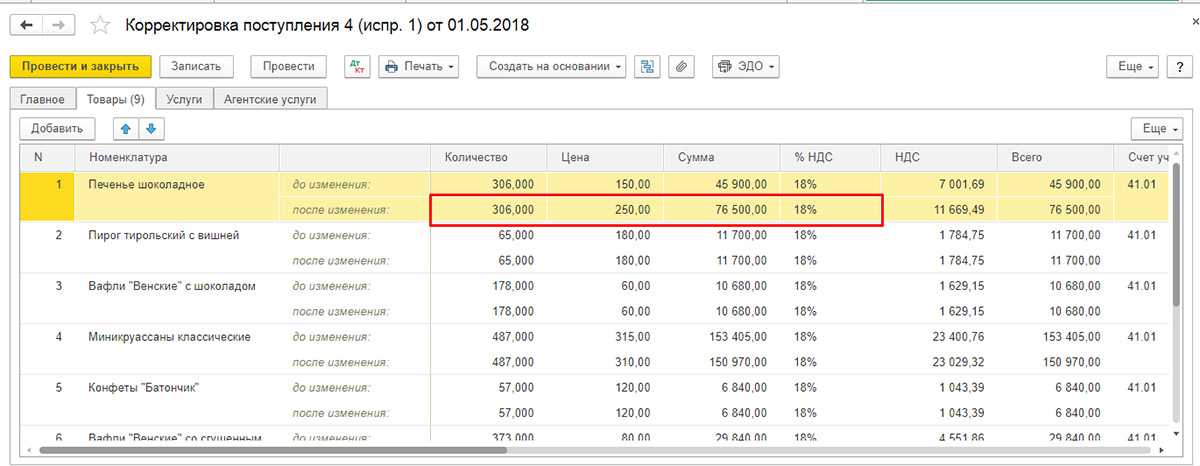 При этом на закладке «Товары» в строку «До изменения» из исходного проведенного документа по поступлению копируется количество и другие цифры, поэтому эта строка недоступна для редактирования. Строка «После изменения» автоматом заполняется аналогичными значениями, но она доступна для внесения данных, которые были изменены. Можно изменить, уменьшить или увеличить количество принятого товара, а также подкорректировать цену, если цена неожиданно изменилась, например, пока товар ехал от поставщика или оператор по выписке накладных внес ошибочные данные в учетную систему.