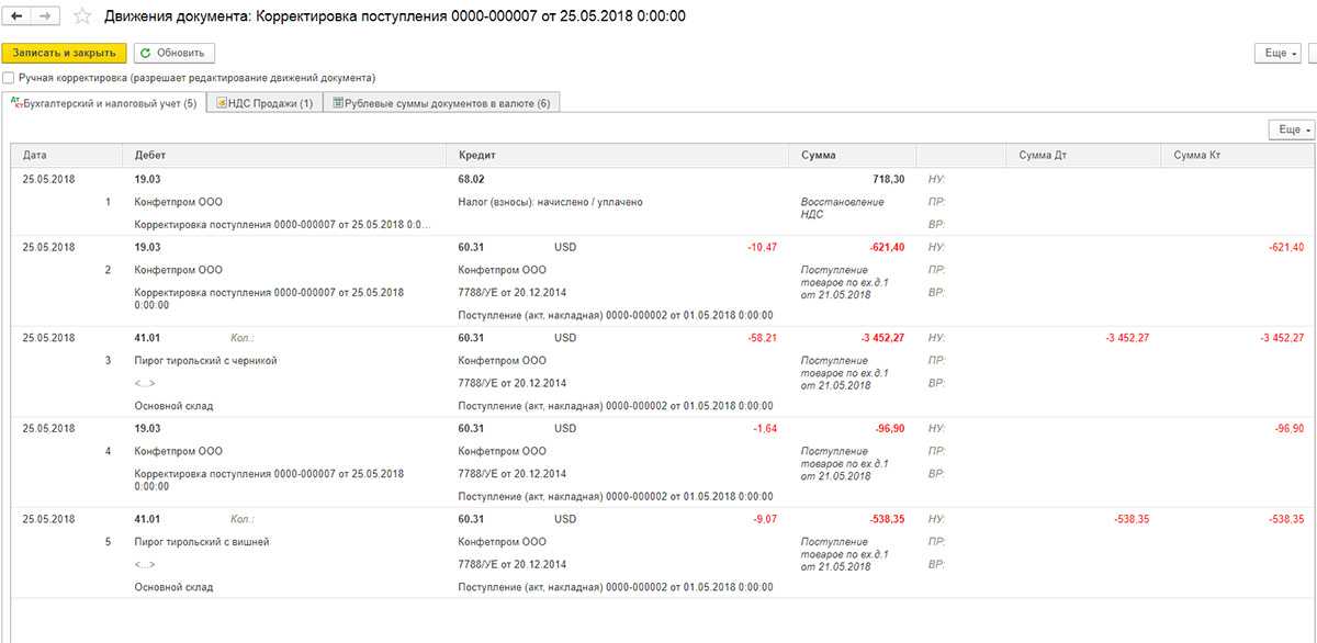 - Во всех разделах учета – формируются проводки по БУ, НУ и движения по регистрам НДС;