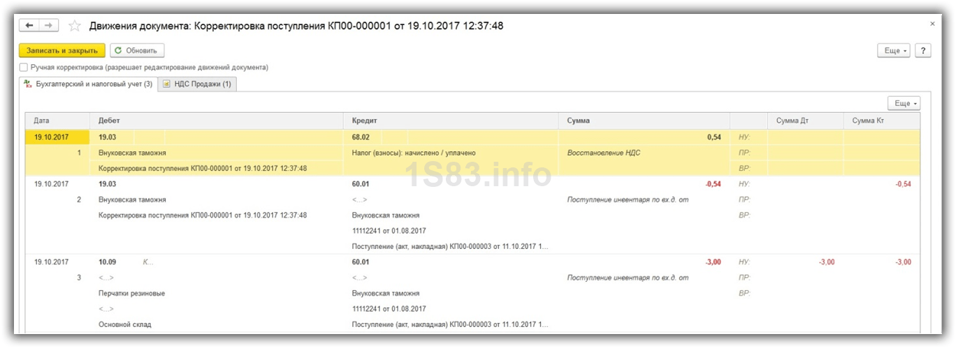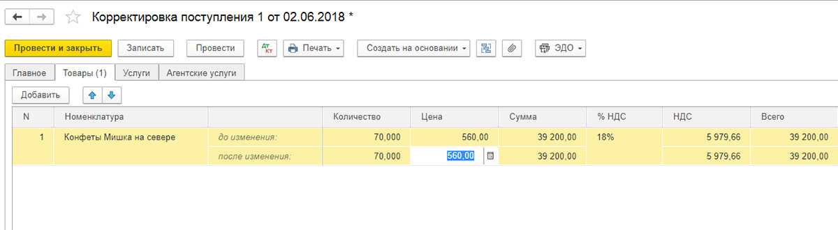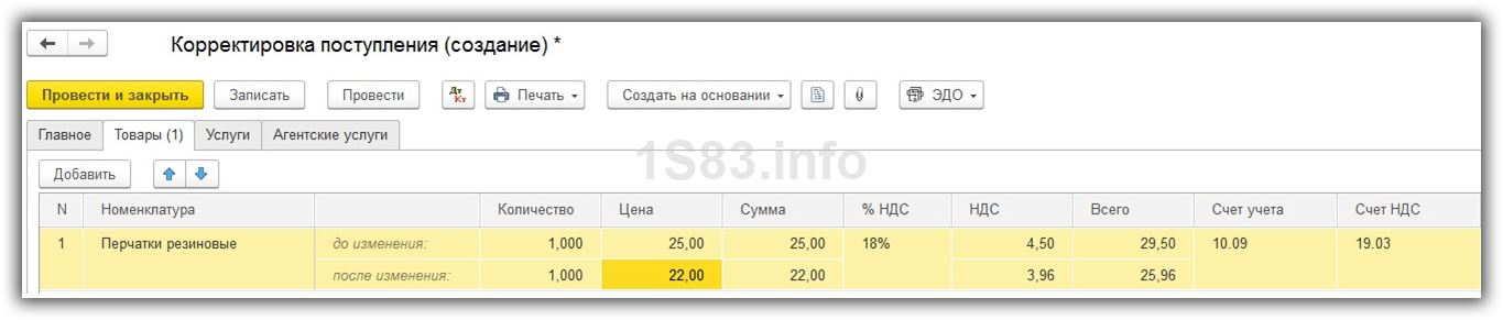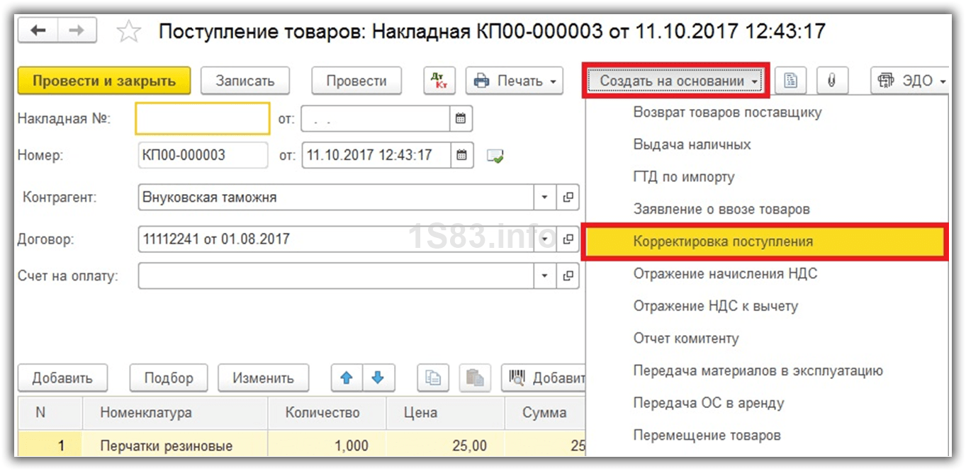 Документ «Корректировка поступления» в 1С 8.3 при приобретении товаров