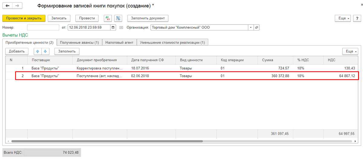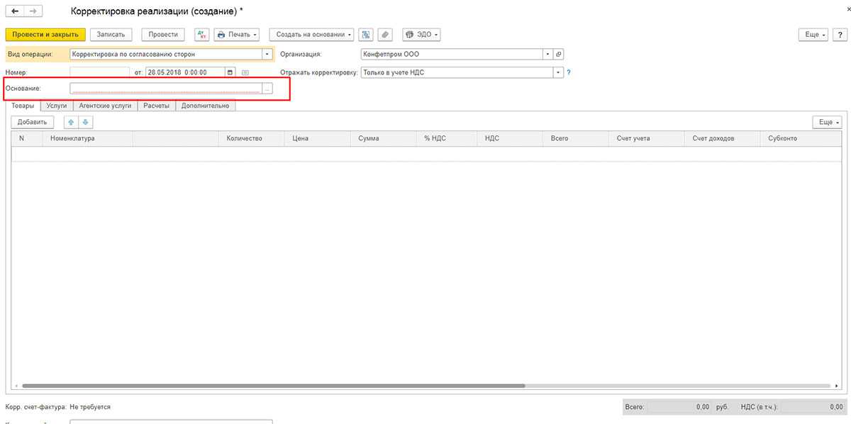 После этого в программе формируется соответствующая запись книги продаж. Это становится возможным при выборе вида требуемой операции «Корректировка по согласованию сторон». В данном случае в «Товарах» ставка НДС недоступна для изменения.