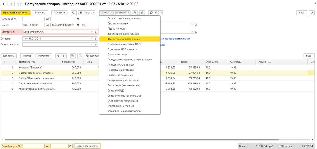 Если корректирующий документ вводится на основании документа поставки, то информация о соответствующем поступлении заполнится автоматом и вбивать ее вручную необходимости не будет. Создавать нужные документы «на основании», как вариант, можно из самого документа поступления, или из их списка.