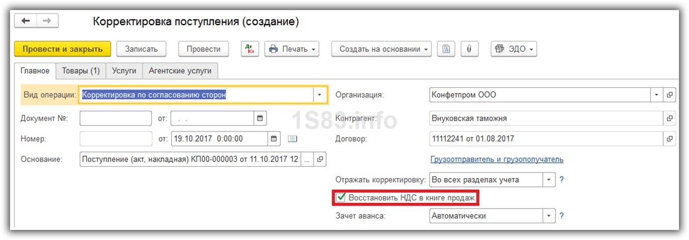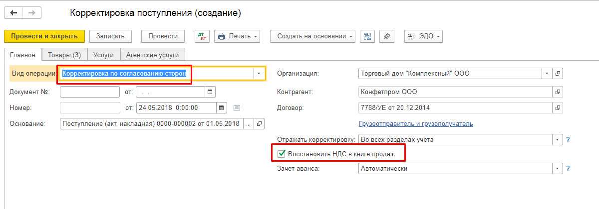 Например, при исправлении поступления в сторону уменьшения необходимо поставить флаг «Восстановить НДС в книге продаж», чтобы восстановить ранее учтенный для вычета НДС. После этого в программе формируется соответствующая запись книги продаж. Это становится возможным при выборе вида требуемой операции «Корректировка по согласованию сторон». В данном случае в «Товарах» ставка НДС недоступна для изменения.