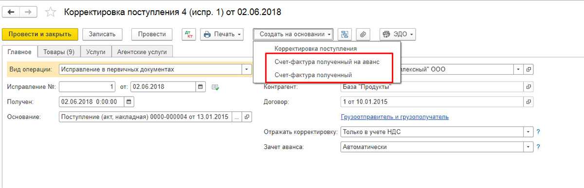 На основании выбранных документов по корректировке приобретения можно создать «Счет-фактура полученный». Данные вносятся по кнопке «Создать на основании» из самого документа или из списка документов приобретения товаров.