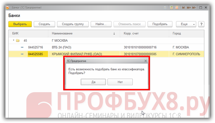 При попытке создать банк вручную, программа 1С 8.3 предложит воспользоваться классификатором: