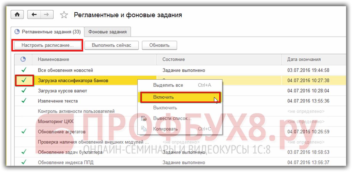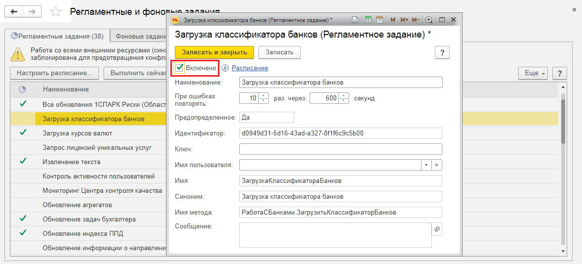 В списке представленных регламентных заданий следует найти «Загрузка классификатора банков» и двойным нажатием мыши открыть окно детальных настроек. Установкой флага «Включено» пользователь активирует работу регламентного задания.
