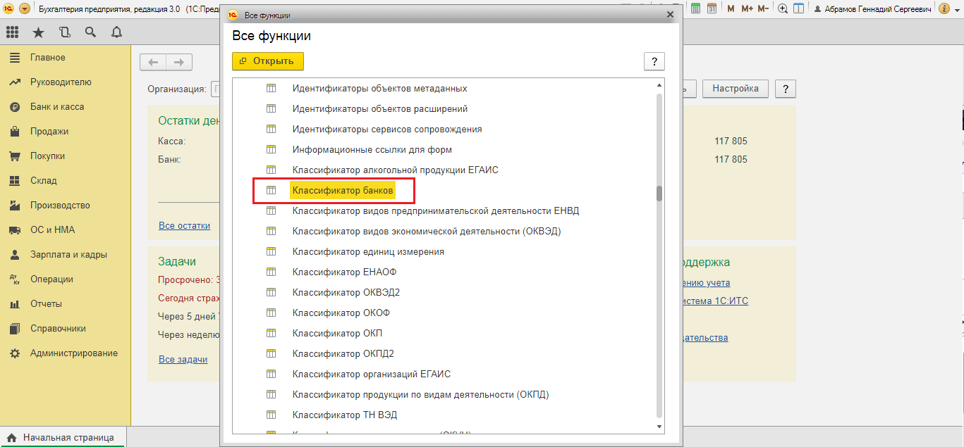 По умолчанию пункт меню «Классификатор банков РФ» не содержится ни в одном из разделов, поэтому для просмотра необходимо настроить панель навигации и добавить данный пункт или открыть справочник через Главное меню / Все функции. В окне списка объектов «Все функции» следует перейти в раздел «Справочники» и выбрать искомый справочник.