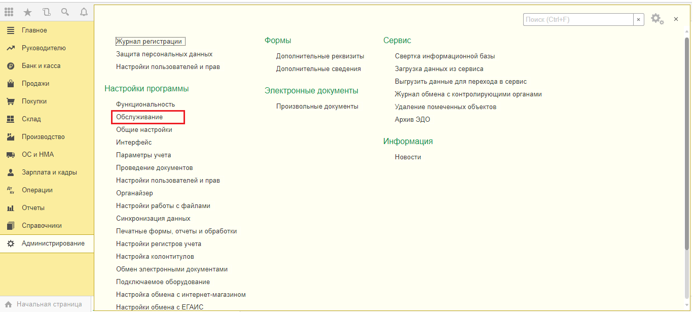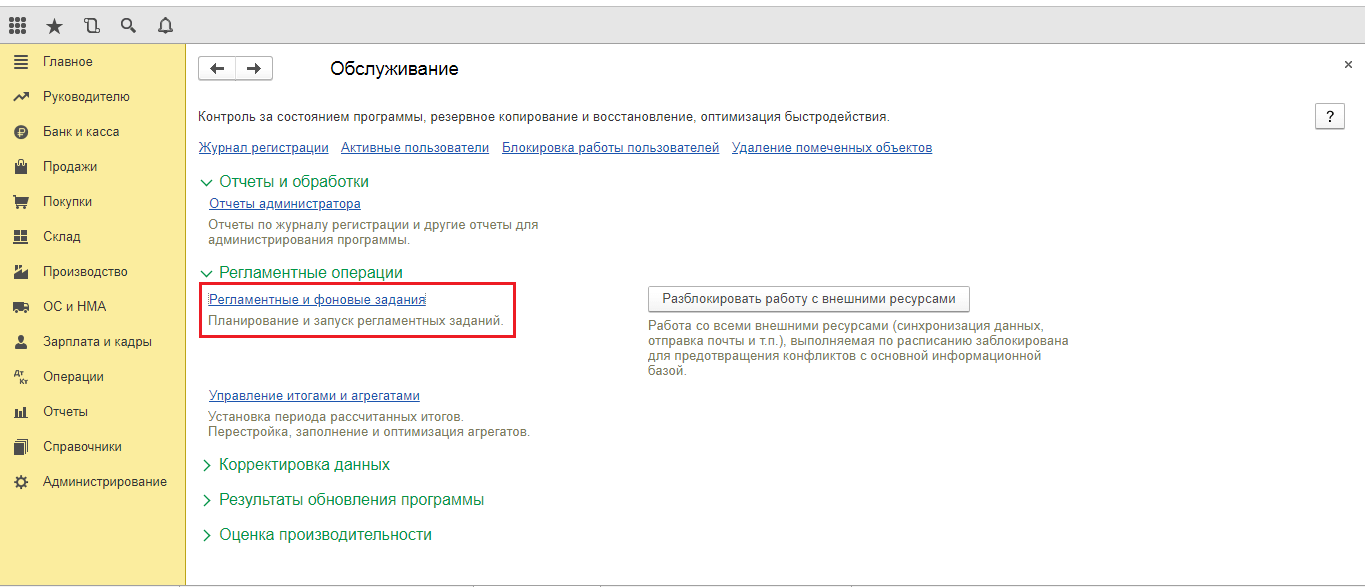 Для открытия списка регламентированных заданий необходимо перейти по пути навигации: Администрирование / Обслуживание.