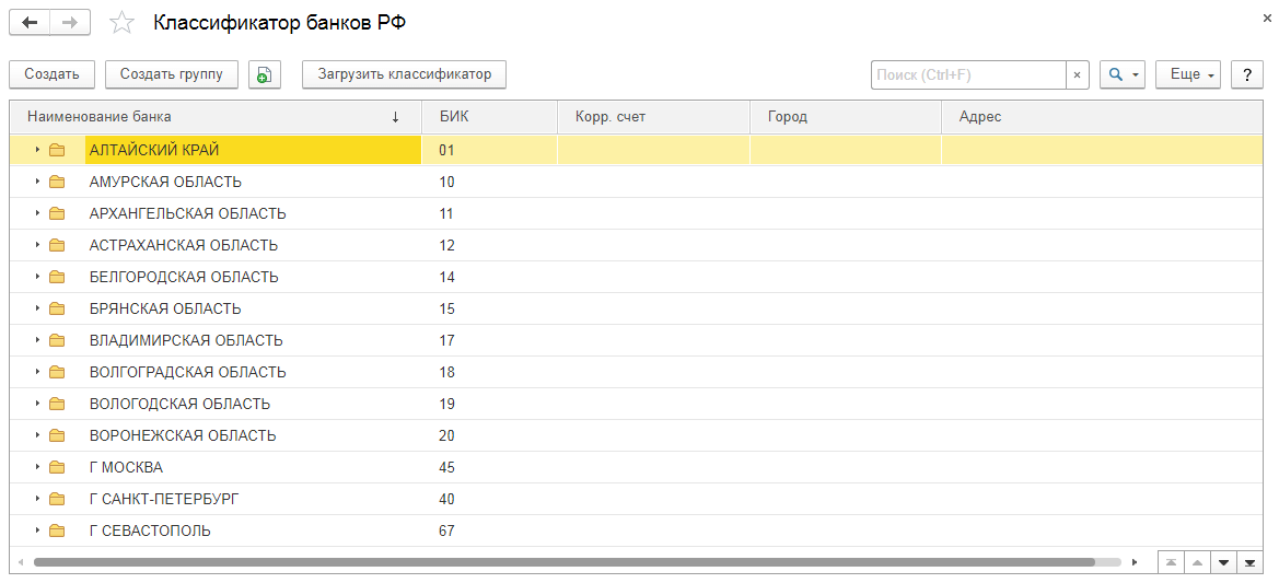 Если перейдем в классификатор, то увидим, что все банки РФ разделены на группы по регионам. Для удобства пользователей есть клавиша поиска, а также загрузки классификатора: