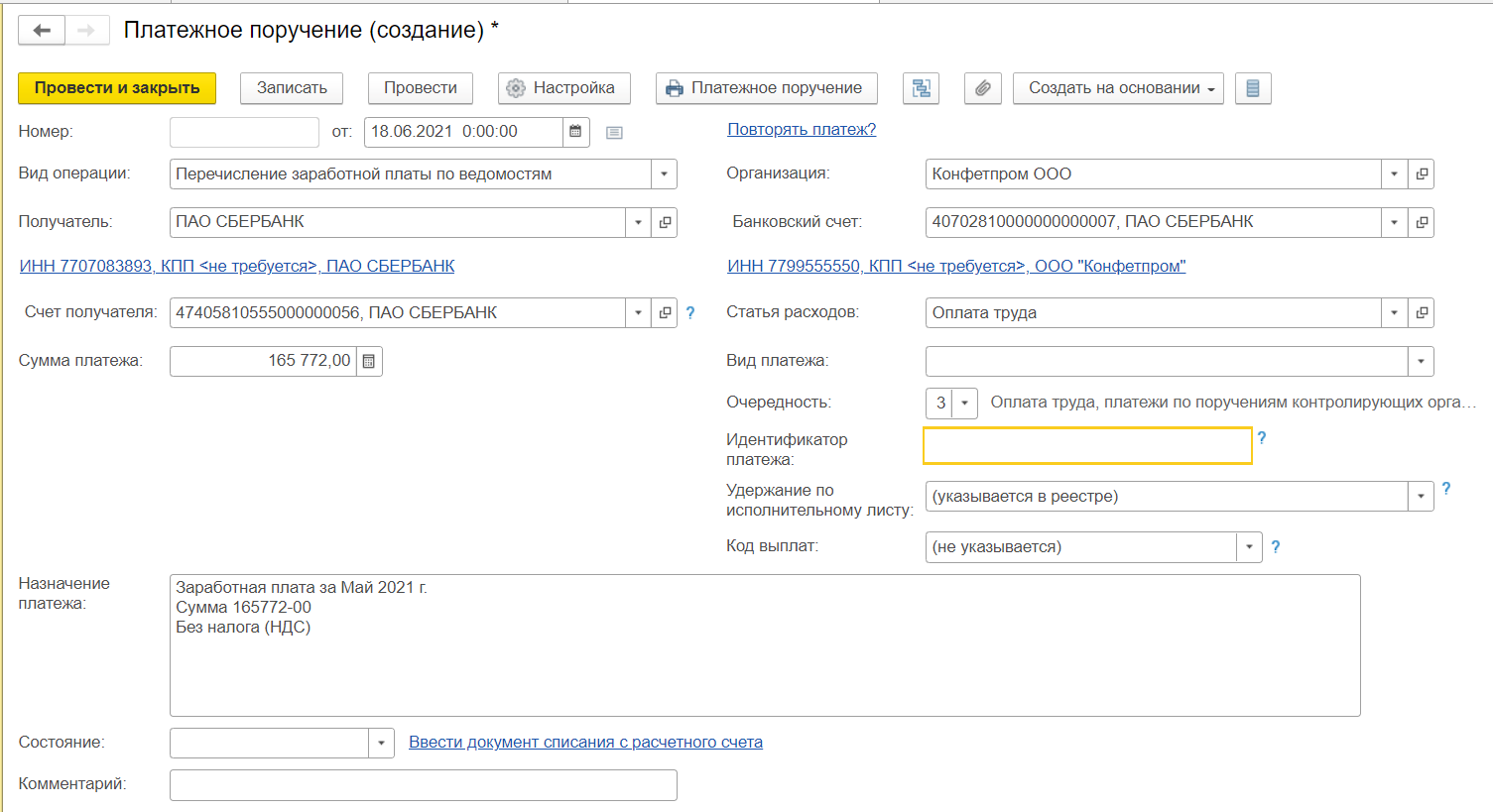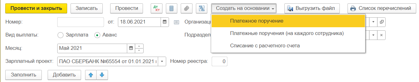 Создание документа Платежное поручение на выплату зарплаты