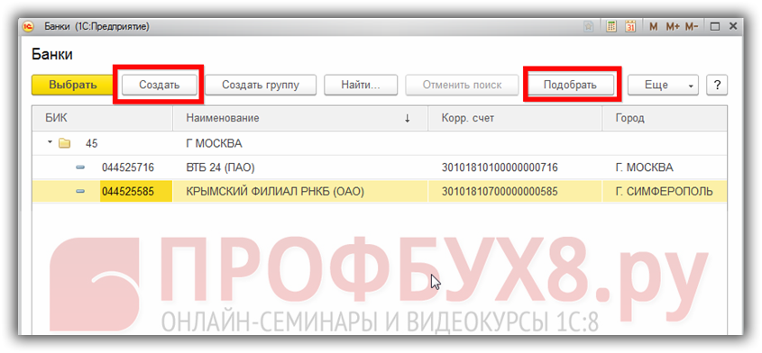 Попадая в справочник банков, можно выбрать банк из классификатора или же создать его вручную (если его нет в классификаторе или нужен «условный» банк):