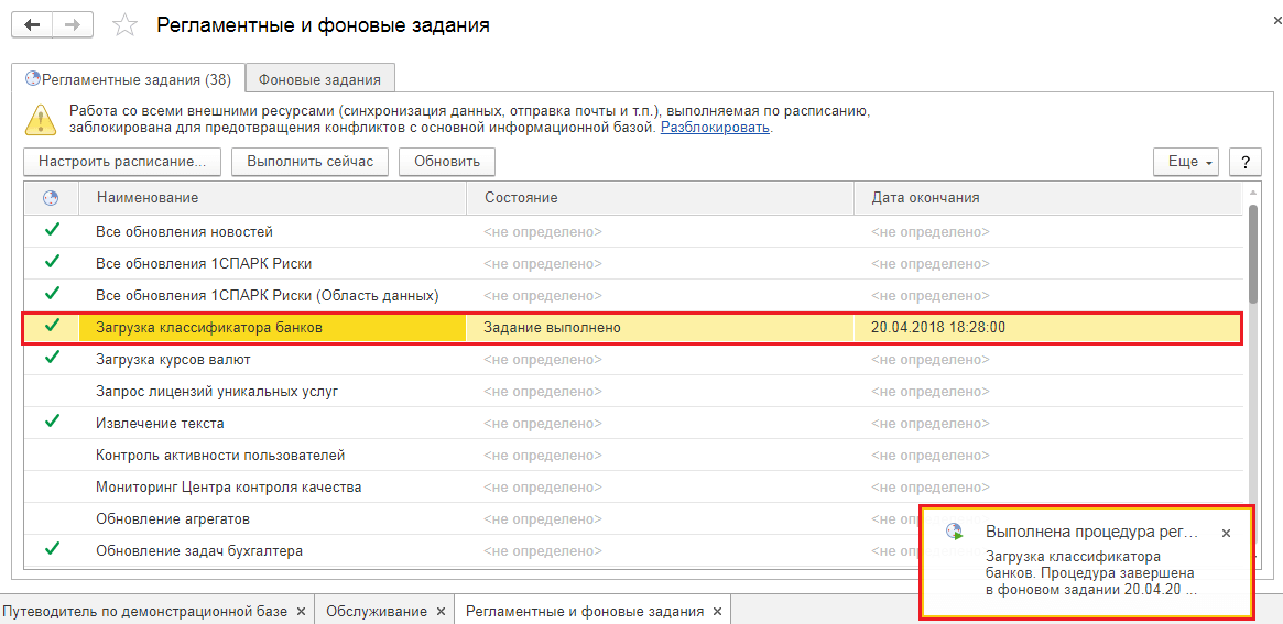 В результате выполнения задания на экран выводится информационное сообщение об успешном завершении процедуры. Также в строке данного регламентного задания устанавливается дата завершения последней запущенной процедуры в поле «Дата окончания» и состояние «Задание выполнено».