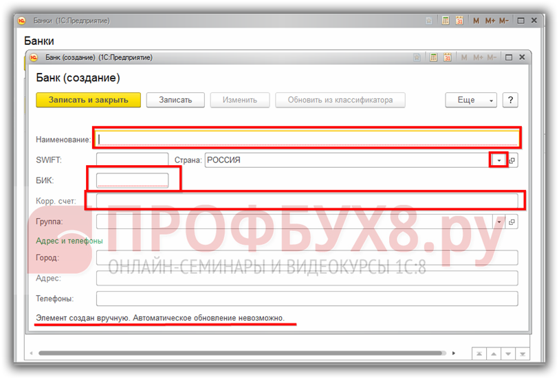 Рассмотрим создание банка в 1С 8.3 «вручную». Для этого необходимо отказаться от подбора из классификатора, после чего попадем в карточку создания банка. В карточке необходимо заполнить два основных поля – наименование банка и его БИК. Остальные поля заполняем при наличии информации: