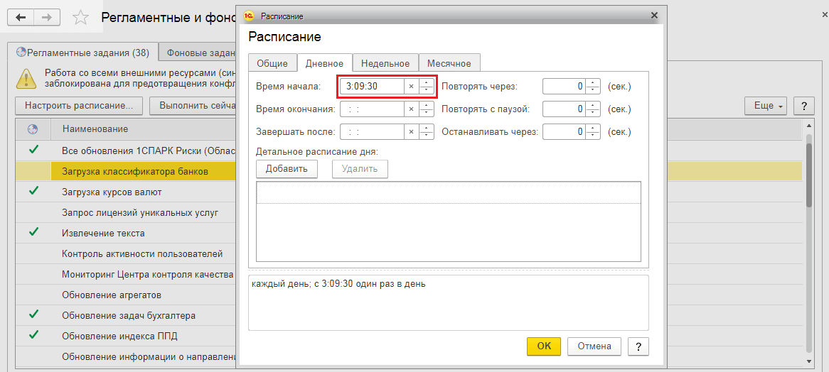 По гиперссылке «Расписание» устанавливается время выполнения процедуры. В качестве примера укажем время запуска 3:09:30 на вкладке «Дневное» для ежедневной загрузки справочника. Рекомендуется устанавливать вечернее или ночное время для снижения нагрузки на систему в рабочие часы.