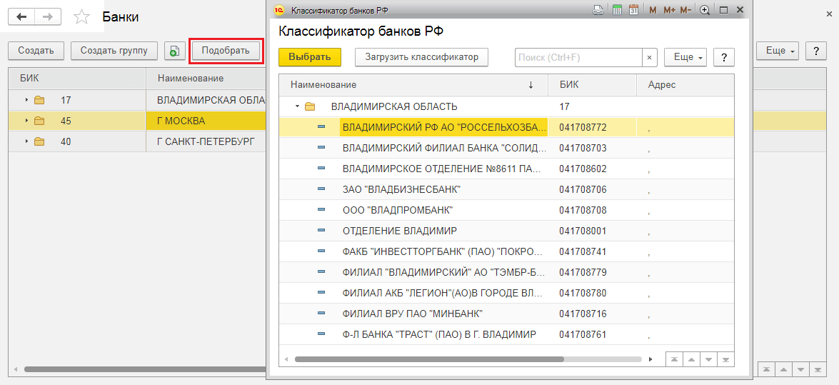Второй вариант загрузки банка в справочник – из классификатора. Для этого, находясь в классификаторе банков, нажимаем кнопку Подобрать из классификатора.
